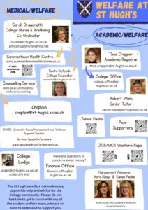 If you are unsure where to go to for help, please email wellbeing@st-hughs.ox.ac.uk for non-urgent enquiries. We aim to respond the next working day. For urgent enquiries, please call the Porter’s Lodge on 01865 274900.