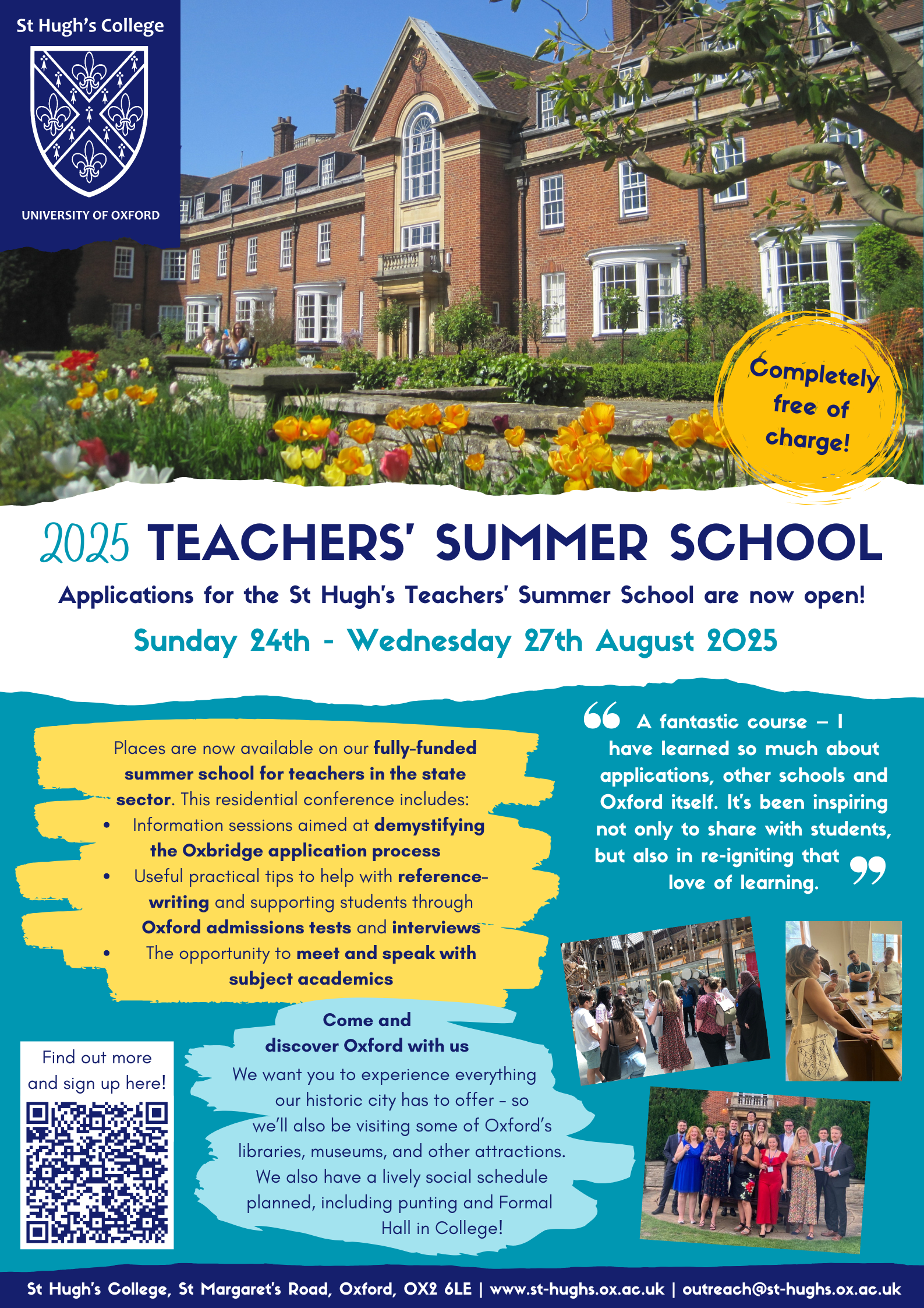 “What a privilege to have been a part of the St Hugh’s Teachers’ Summer School. I feel extremely fortunate to have been given such an opportunity to learn so much about the application process but also the extraordinary work that the college and the university are doing to widen access and support those students concerned throughout their degree and beyond. […] Every single aspect of the conference was so carefully curated and made for an incredibly enriching experience. […] I returned energised and inspired, as well as eager to share such newly gained knowledge with both students and staff across our colleges. I can not thank you both enough for such a fantastic few days.”