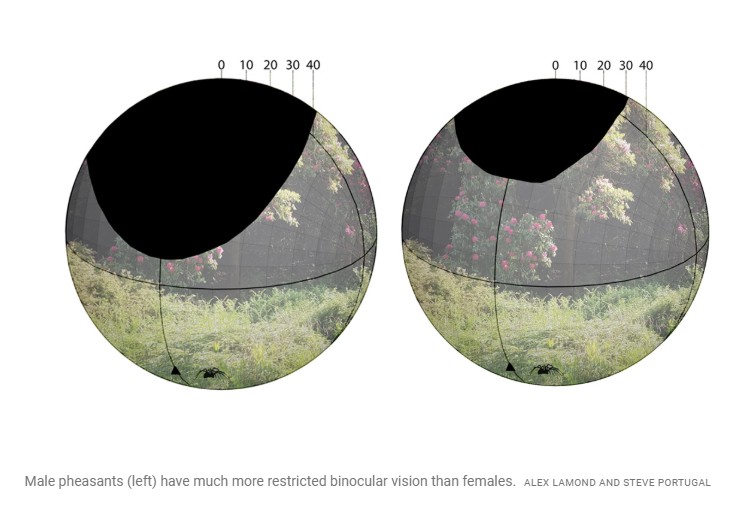 Professor Portugal said, ‘Looking this good comes with a cost. This amazing hairdo cuts out a large portion of their vision – love practically makes these birds go blind.’ When Professor Portugal and his team examined the pheasants’ eyes, they discovered that the toupee of “love feathers” of male golden and Lady Amherst’s pheasants compromised their binocular vision – especially their ability to look above them – by an average of 41% more than that of their female counterparts.