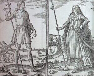 These individuals represented are artistic depictions of the Picts, or a people from modern-day Scotland. The term ‘Pict’ is derived from the Roman name ‘Picti’ meaning “painted people” which traditionally refers to the practice of tattooing one’s body (Sayers, 2023). It was first used to differentiate between the Roman and non-Roman Britons during the period of Roman occupation. Harriot utilised the images in his history to demonstrate that the early inhabitants of Bretannie were as similarly ‘savage’ to the peoples of the New World. Speed, fascinatingly enough, greatly enjoyed these images and claimed that the Picts were of a distant relation to the Britons as evidence enough to include their artistic representations in his book (Sayers, 2023).
