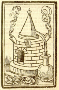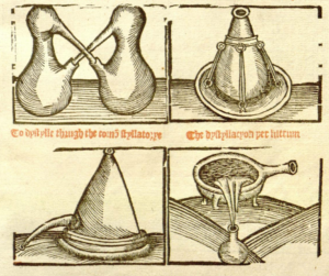 We have learned how death influenced our culture and media, but what about the process of evading death entirely? Of ancient origins, alchemy was a pseudoscientific process that attempted to both transform base metals such as lead into silver or gold, and create elixirs to cure illnesses including death itself (Gilbert and Multhauf, circa 2025). Though a seemingly mystical practice by modern eyes, alchemy utilised the early beginnings of the scientific method through the testing and analysing of hypotheses. The engravings pictured here provided by the 17th c. text The Vertuose booke of Distyllacyon depict the process of distillation. During this crucial step, a liquid substance was boiled in a glass vessel with a long neck called a retort. As the liquid evaporated and the steam condensed, the substance in its vaporized state would collect through the neck of the vessel until it cooled as a liquid into a container on the opposing side (The Editors of Encyclopaedia Britannica, 2009). It was believed that this process separated the substance from its “volatile impurities” and created a purer substance (Daniel, 2009).
