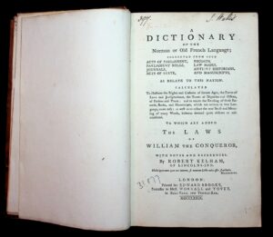 The dictionary on display was penned by Robert Kelham, an English attorney and legal antiquarian. Within it is a display of Law-French, a language derived from Anglo-Norman and used in the English courts (Tarlton Law Library, circa 2008). Though English would become the primary language of Parliament by the mid 14th century, reports and professional notes were written in Law-French until the reign of Charles II. The last publication to display Law-French was around 1690 with its official end in 1731. (Tarlton Law Library, circa 2008).