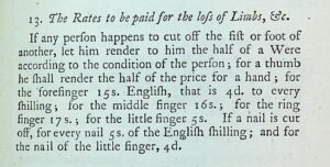 Seen here is an example of medieval law from the period of William the Conqueror. One passage is within the Norman language while the other is in Early Modern English. This specific law regards the punishment of any individual who maims another. For example, if a person was to cut off someone else’s thumb, the price would be the individual’s hand.