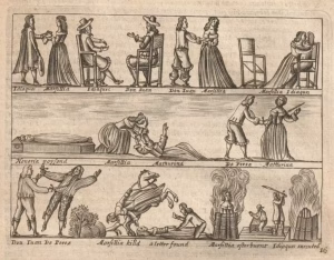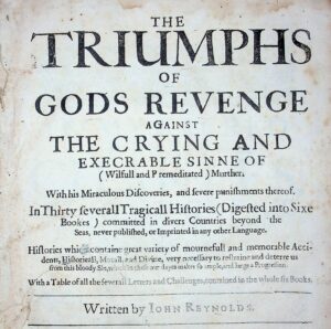 The book shown here is The Triumphs of God’s Revenge, a grotesque compilation of true crime cases showcasing the power of sins such as lust, greed, revenge, and envy to corrupt good Christians. The text follows a pattern of displaying tales of deception, adultery, and homicide framed within the context of God’s triumph over acts of sinfulness (Northwestern, 2021). The Triumphs of God’s Revenge was written in 1621 by author John Reynolds (c.1588-1655?), an English writer and merchant from Exeter. The popularity of this publication inspired five future parts which were collected into a singular volume in 1635. This collection was reprinted in 1639 and 1640, with a second edition of the text displayed here.
